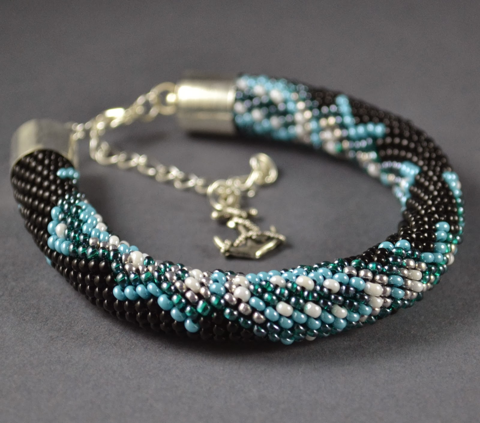 Bransoletka zrobiona na szydełku z małych szklanych koralików toho.